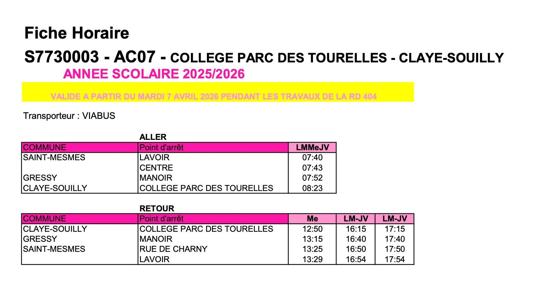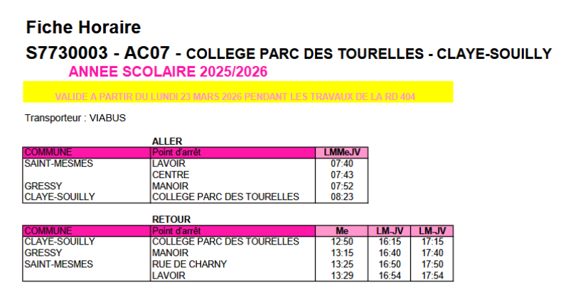 Veuillez noter que les horaires de transport ont été modifiés pour la desserte du collège.